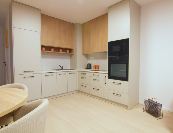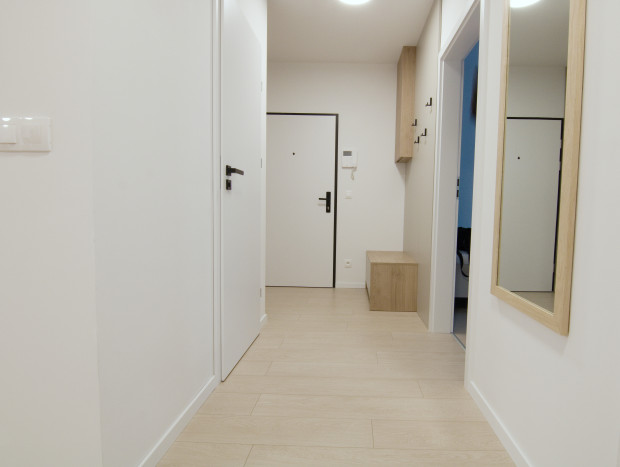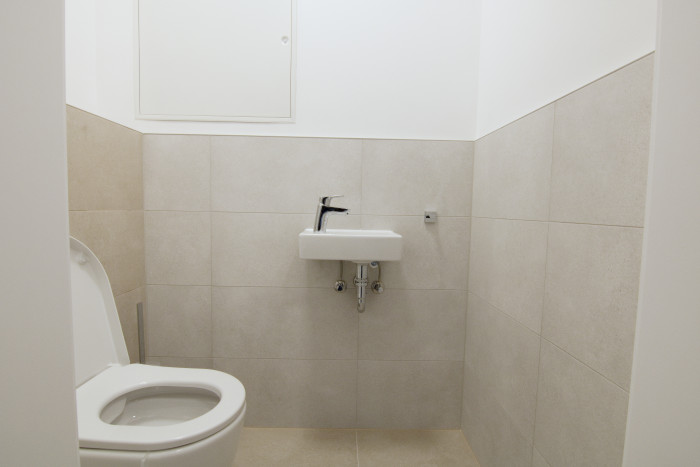 Zo vstupnej chodby, v ktorej sa nachádza šatník a samostatná toaleta sa dostaneme do priestrannej, svetlej kuchyne s obývačkou a kúpeľne a samostatnou toaletou. Kuchyňa je vybavená najnovšími spotrebičmi (elektrická varná doska, elektr. rúra, chladnička s mrazničkou, mikrovlnná rúra, umývačka riadu, digestor) a štýlovým nábytkom, ktorý spája moderný dizajn s praktickými riešeniami. V kúpeľni je vaňa a práčka.