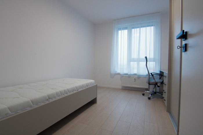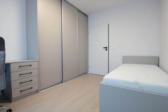 Z chodby je vstup do spálne s veľkou manželskou posteľou a vstavanou skriňou s dostatočným úložným priestorom, a do tretej zariadenej izby (študentskej, detskej, pracovne). Na oknách sú hliníkové žalúzie.
