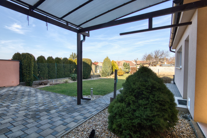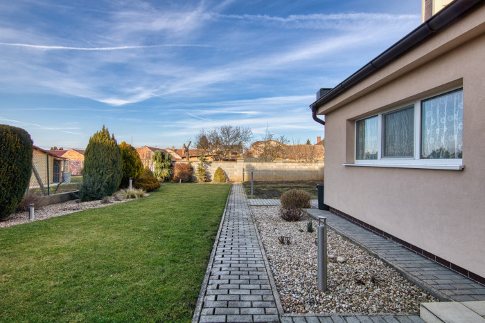 Pozemok o výmere 584 m² je rovinatý, starostlivo udržiavaný a poskytuje ideálne zázemie pre relax aj záhradkárčenie. Nájdete tu okrasnú predzáhradku, vlastnú studňu, zavlažovací systém a dostatok súkromia vďaka oploteniu a elektrickej bráne. Príjemným bonusom je aj garáž upravená na letnú kuchynku s prístreškom, ideálnu na rodinné stretnutia či letné posedenia.