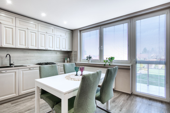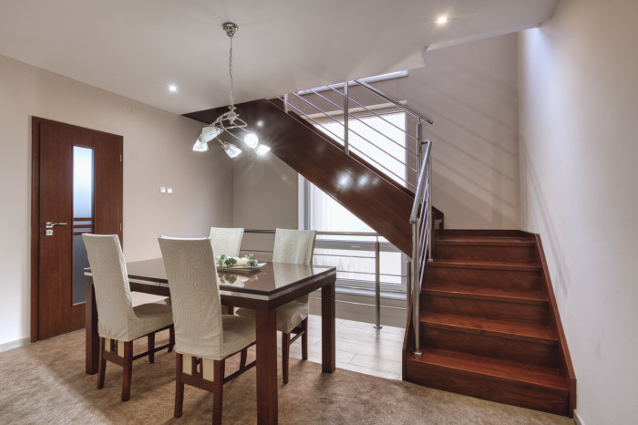 Srdcom prízemia je otvorený priestor vstupnej haly spojenej s jedálňou, kde dominuje elegantné masívne drevené schodisko, ktoré dodáva interiéru charakter a štýl. Z haly sa plynulo dostanete do najväčšej izby s veľkým trojoknom, ktoré zabezpečuje dostatok denného svetla. Prakticky riešená kuchyňa so špajzou a modernou linkou so zabudovanými spotrebičmi ponúka priamy výstup na terasu, kde si vychutnáte pokoj a zeleň vlastnej záhrady.