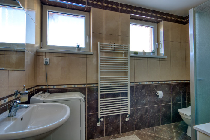 Na prízemí nechýba ani samostatná izba vhodná ako pracovňa či hosťovská izba a priestranná kúpeľňa so sprchovým kútom a WC.